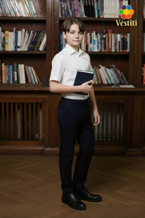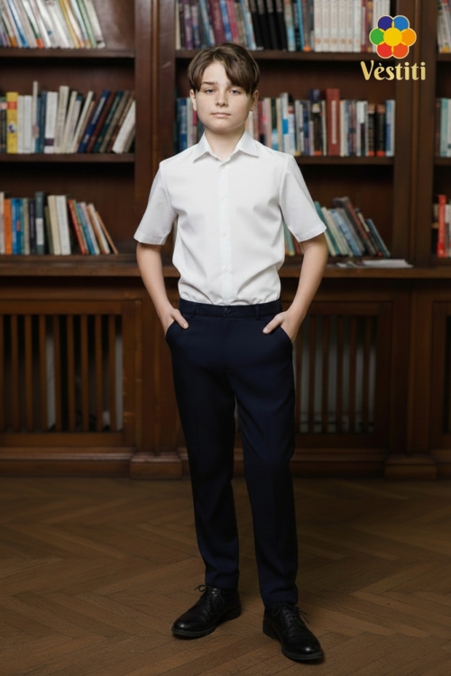 Cămașă clasică albă pentru băieți, cu mânecă scurtă, croială elegantă, ideală pentru uniforma școlară și ocazii speciale. Materialul combinat din bumbac și poliester asigură confort, rezistență și întreținere ușoară. Se potrivește perfect cu pantaloni clasici sau costume școlare.