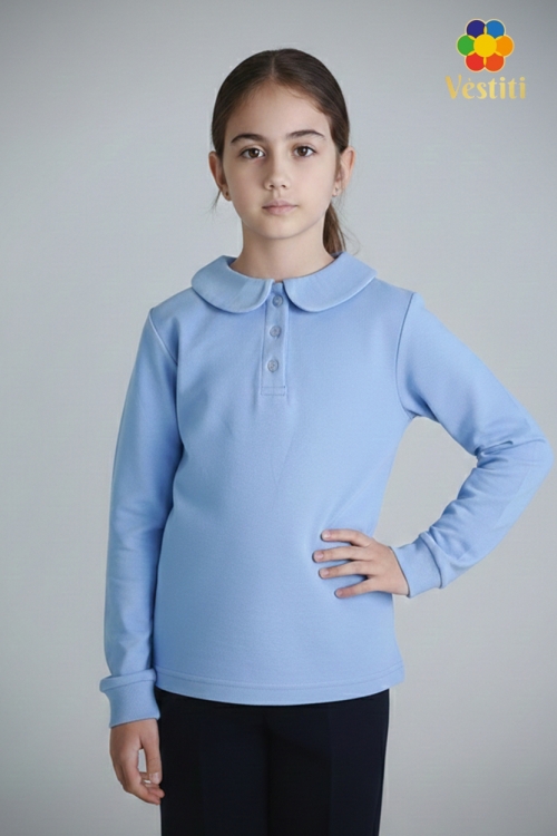 Tricou polo elegant cu guler franțuzesc — alegerea perfectă pentru școală și purtare zilnică. Modelul este realizat în culoare albastru deschis, prevăzut cu fentă cu nasturi și mânecă lungă. Gulerul franțuzesc oferă un aspect rafinat și îngrijit. Materialul este moale și plăcut la atingere, își păstrează bine forma și asigură confort pe tot parcursul zilei.