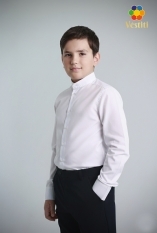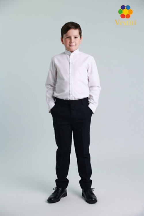 Классическая белая рубашка с воротником стойка для мальчиков с длинным рукавом и аккуратным кроем, идеально подходит для школьной формы и торжественных мероприятий. Комбинированная ткань из хлопка и полиэстера обеспечивает комфорт, долговечность и легкий уход. Хорошо сочетается с классическими брюками и школьными костюмами.
