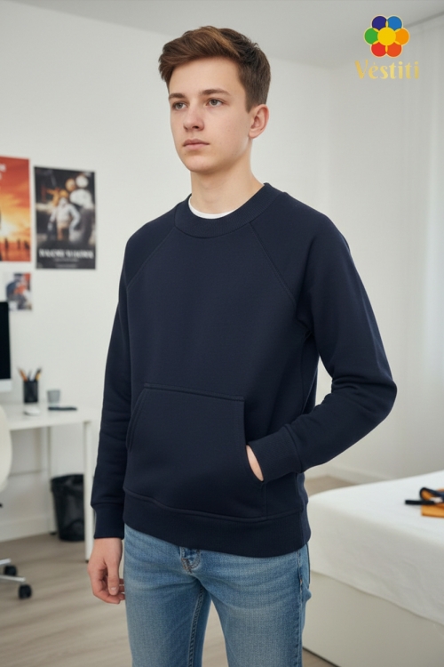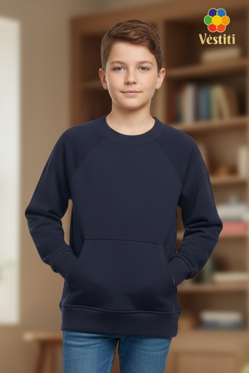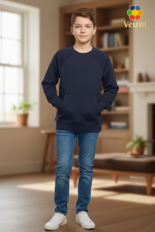 Hanorac din bumbac tip 3 fire, culoare bleumarin, confortabil și practic pentru purtare zilnică. Model cu mânecă raglan pentru o potrivire lejeră și libertate de mișcare. Prevăzut cu buzunar tip cangur în partea frontală. Manșetele și partea de jos sunt finisate cu bandă elastică, iar gulerul este realizat din rib elastic moale. Potrivit pentru școală și ținute casual.