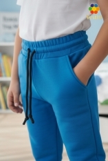 Pantaloni sport pentru băieți de culoare turcoaz cu manșete bleumarin — model confortabil și practic pentru purtare zilnică. Confecționați din tricot gros 3 fire, care își păstrează bine forma și oferă confort termic.