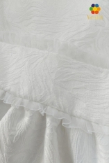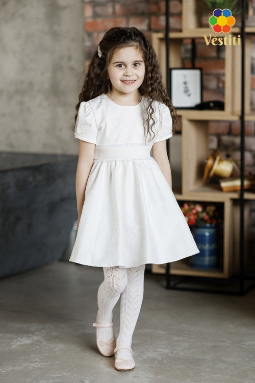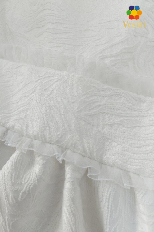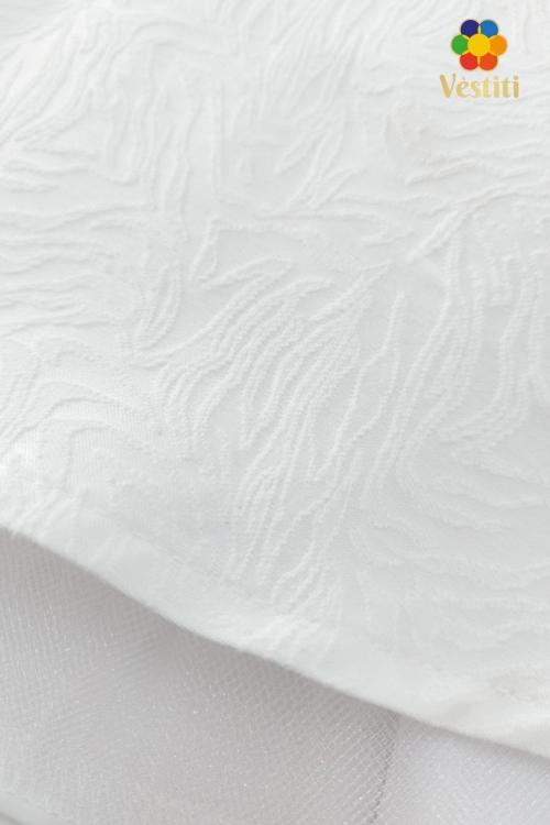 Rochie elegantă albă din jacquard texturat, ideală pentru evenimente festive și ocazii speciale. Model cu șnururi decorative, decolteu rotund și mânecă scurtă cu nasture decorativ. Se închide la spate cu fermoar. Fusta amplă își păstrează frumos forma, iar căptușeala cu fatin în partea de jos oferă volum suplimentar și un plus de rafinament.
