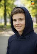 Hanoracul este fără fermoar, cu glugă și buzunare, iar mânecile raglan se termină cu manșete elastice. Pantalonii au talie pe elastic cu șnur pentru ajustare, buzunare laterale și manșete la bază.