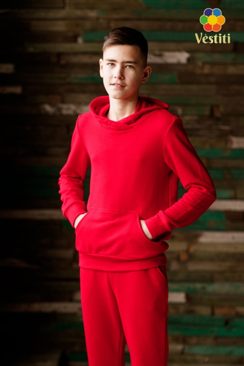 Hanoracul este fără fermoar, cu glugă și buzunare, mânecile se termină cu manșete elastice. Pantalonii au talie pe elastic cu șnur pentru ajustare, buzunare laterale și manșete la bază.