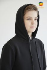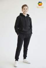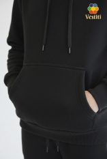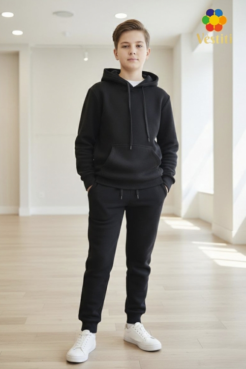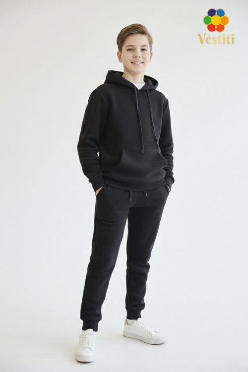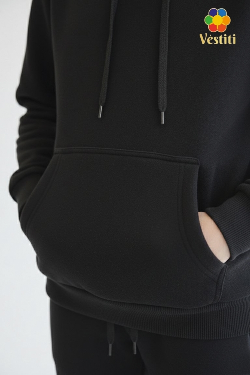 Trening negru din molton – o alegere confortabilă și practică pentru purtare zilnică. Setul este compus din hanorac cu glugă și buzunar tip cangur, precum și pantaloni cu buzunare laterale și talie elastică cu șnur reglabil. Materialul moale și călduros este plăcut la atingere și oferă confort pe tot parcursul zilei. Ideal pentru școală, plimbări și activități zilnice.