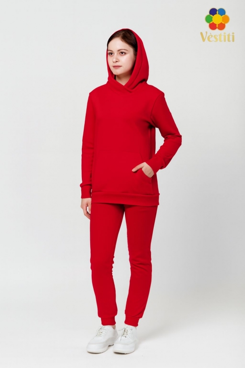 Hanoracul este fără fermoar, cu glugă și buzunare, mânecile se termină cu manșete elastice. Pantalonii au talie pe elastic cu șnur pentru ajustare, buzunare laterale și manșete la bază.