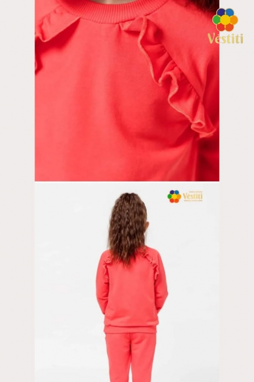 Bluza: fără glugă, mânecă lungă raglan cu manșetă, decorată cu volane.
