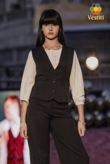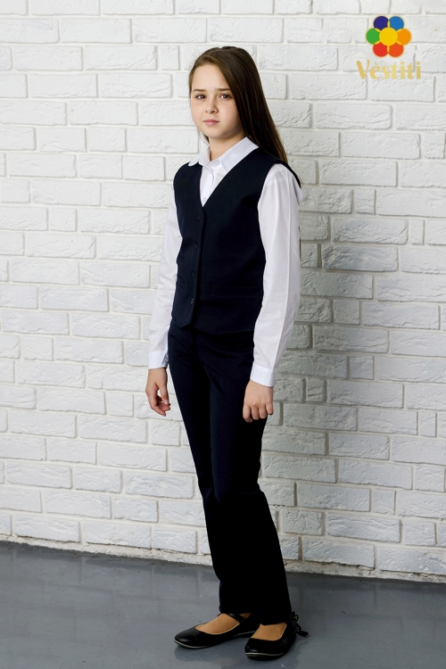 Vestă clasică albastru închis pentru fete. Confecționată din stofă de costum cu lână, oferă confort și un aspect elegant. La spate are un sistem de ajustare a taliei cu curea și cataramă, pentru o potrivire perfectă. Ideală pentru uniforme școlare, evenimente festive și ținute formale.