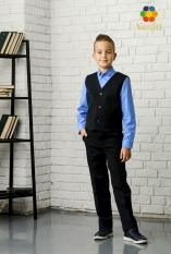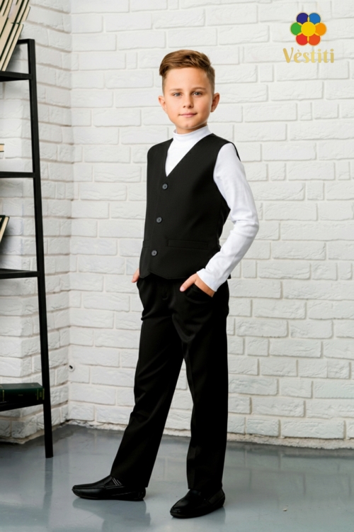 Vestă clasică neagră pentru băieți. Confecționată din stofă de costum cu lână, oferă confort și un aspect elegant. La spate are un sistem de ajustare a taliei cu curea și cataramă, pentru o potrivire perfectă. Ideală pentru uniforme școlare, evenimente festive și ținute formale.