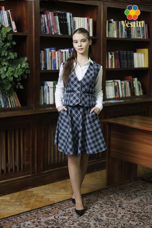 Vestă clasică în carouri pentru fete. Design elegant cu model tartan, cu buzunare decorative. Polca este realizată din material în carou sur, iar partea din spate este confecționată din țesătură uni de culoare albastru închis. Spatele este prevăzut cu un sistem de ajustare a taliei pentru o potrivire confortabilă. Modelul este completat cu o căptușeală naturală.
