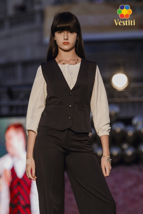 Vestă clasică neagră pentru fete. Confecționată din stofă de costum cu lână, oferă confort și un aspect elegant. La spate are un sistem de ajustare a taliei cu curea și cataramă, pentru o potrivire perfectă. Ideală pentru uniforme școlare, evenimente festive și ținute formale.