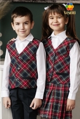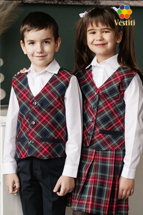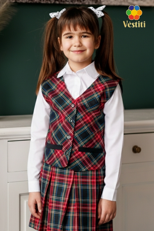 Vestă clasică în carouri pentru fete. Design elegant cu model tartan, cu buzunare decorative. Polca este realizată din material roșu mare în carouri, iar partea din spate este confecționată din țesătură uni de culoare albastru închis. Spatele este prevăzut cu un sistem de ajustare a taliei pentru o potrivire confortabilă. Modelul este completat cu o căptușeală naturală.