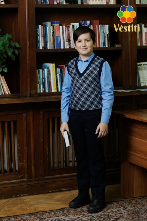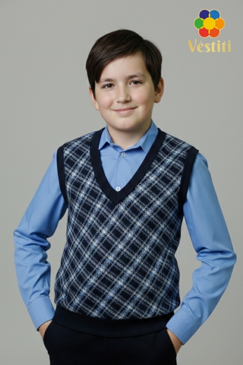 Vestă tricotată pentru băieți, cu design clasic în carouri. Model fără mâneci, cu decolteu în V și margini contrastante, ideală pentru purtarea peste cămașă. Oferă un aspect elegant și ordonat, fiind potrivită pentru uniforma școlară și utilizarea zilnică.