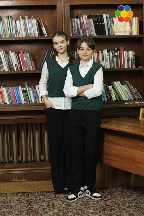 Vestă tricotată pentru băieți, realizată într-un stil clasic și elegant. Model fără mâneci, cu decolteu în V, ideal pentru purtarea peste cămașă. Țesătura este plăcută la atingere și confortabilă pentru utilizare zilnică la școală.