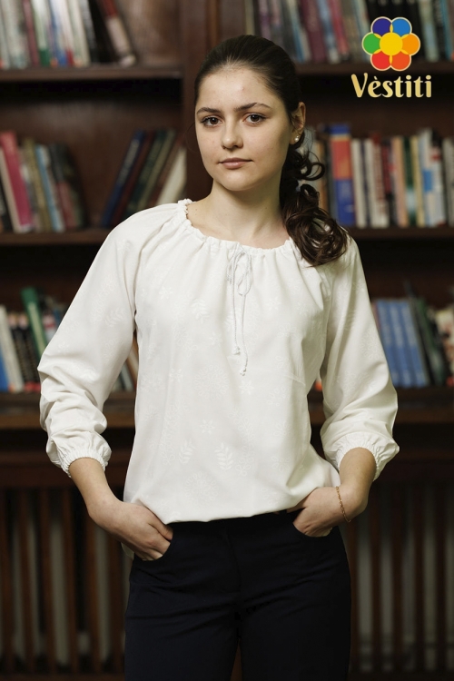 Bluză-ie albă, confecționată din material ușor și plăcut la purtare. Model cu mânecă lungă de tip raglan, manșete elastice și decolteu rotund cu șnur decorativ. Design simplu și elegant, potrivit pentru școală. Se asortează ușor cu pantaloni sau fuste.