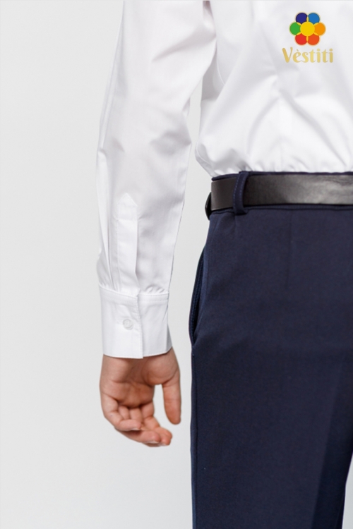 Классическая белая рубашка для мальчиков с длинным рукавом и аккуратным кроем, идеально подходит для школьной формы и торжественных мероприятий. Комбинированная ткань из хлопка и полиэстера обеспечивает комфорт, долговечность и легкий уход. Хорошо сочетается с классическими брюками и школьными костюмами.