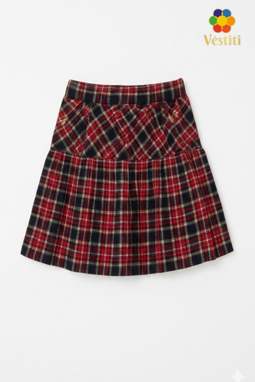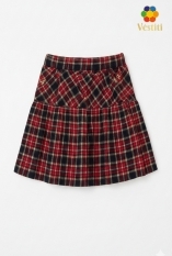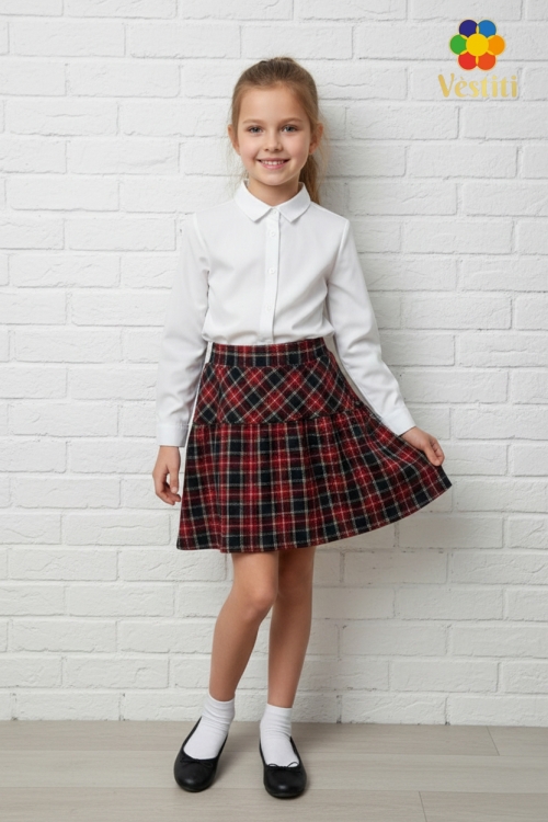 Fustă tricotată pentru fete, cu imprimeu clasic în carouri — un model practic și confortabil pentru purtare zilnică. Materialul moale și plăcut la atingere oferă libertate de mișcare, iar croiala ușor evazată se așază frumos pe siluetă. Partea superioară este realizată cu o betelie tip cochetă lată, care asigură o fixare ordonată pe talie. Fusta se combină ușor cu cămăși, veste și sacouri, fiind potrivită pentru uniformă școlară.