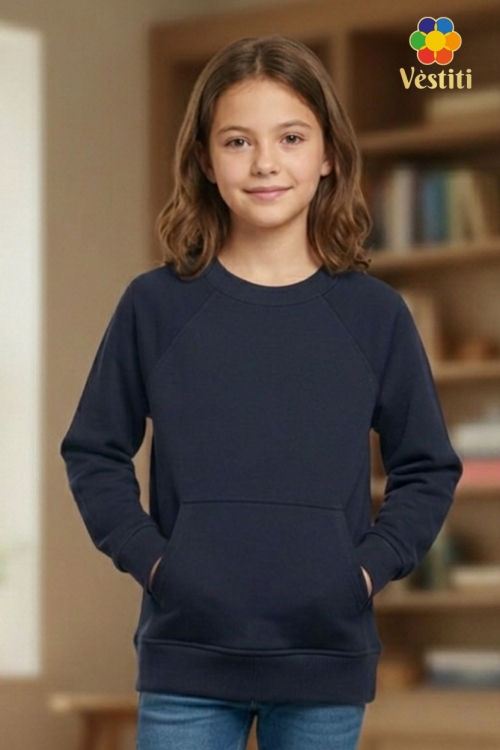 Hanorac din bumbac tip 3 fire, culoare bleumarin, confortabil și practic pentru purtare zilnică. Model cu mânecă raglan pentru o potrivire lejeră și libertate de mișcare. Prevăzut cu buzunar tip cangur în partea frontală. Manșetele și partea de jos sunt finisate cu bandă elastică, iar gulerul este realizat din rib elastic moale. Potrivit pentru școală și ținute casual.