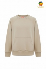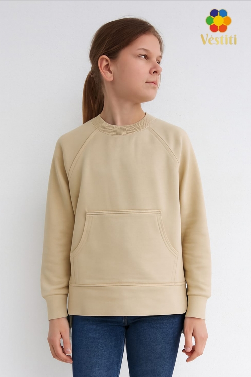 Hanorac fără glugă pentru copii, realizat din tricot „2 fire” de calitate superioară. Modelul este prevăzut cu buzunar tip cangur, mâneci raglan cu manșete și oferă o potrivire confortabilă, ideală pentru purtare zilnică.