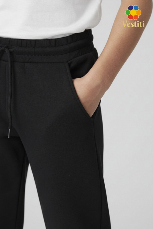 Pantaloni sport comozi și practici din tricot în 2 fire, ideali pentru purtare zilnică și activități dinamice. Model realizat în culoare negru clasic, cu croială modernă și finisaje atent executate.