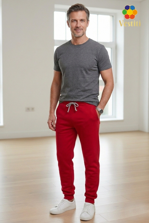 Pantaloni sport pentru bărbați de culoare roșu — model confortabil și practic pentru purtare zilnică. Confecționați din tricot gros 3 fire, care își păstrează bine forma și oferă confort termic.
