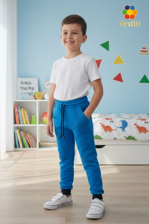 Pantaloni sport pentru băieți de culoare turcoaz cu manșete bleumarin — model confortabil și practic pentru purtare zilnică. Confecționați din tricot gros 3 fire, care își păstrează bine forma și oferă confort termic.