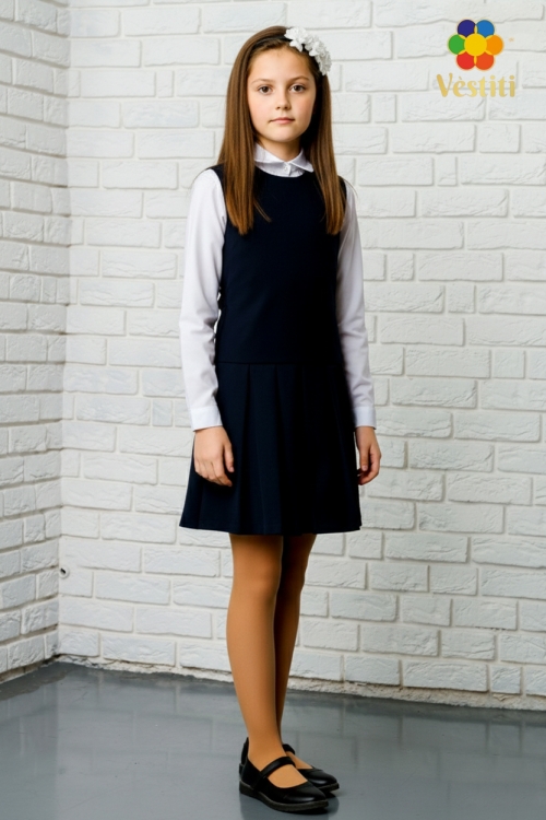 Sarafan școlar elegant de culoare albastru închis clasic. Modelul este realizat cu partea superioară atent finisată și căptușeală naturală, oferind confort în timpul purtării zilnice. Partea inferioară este plisată, creând o siluetă îngrijită și ordonată.