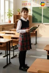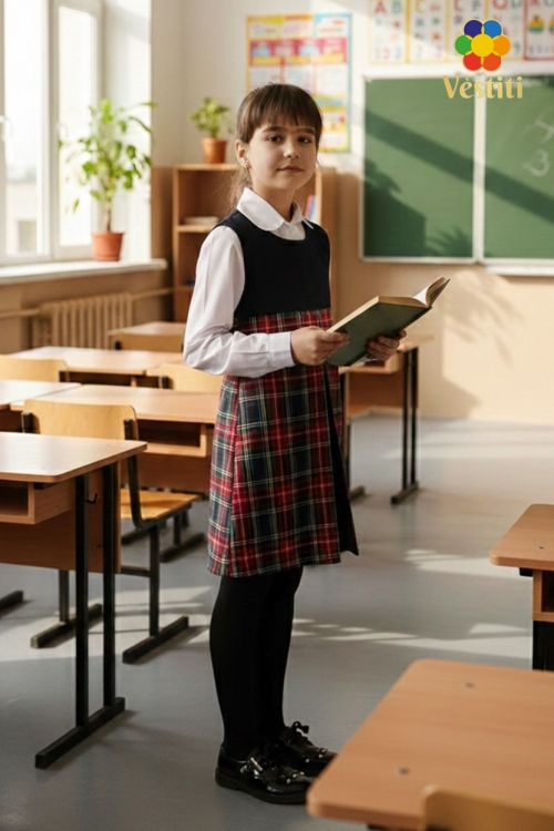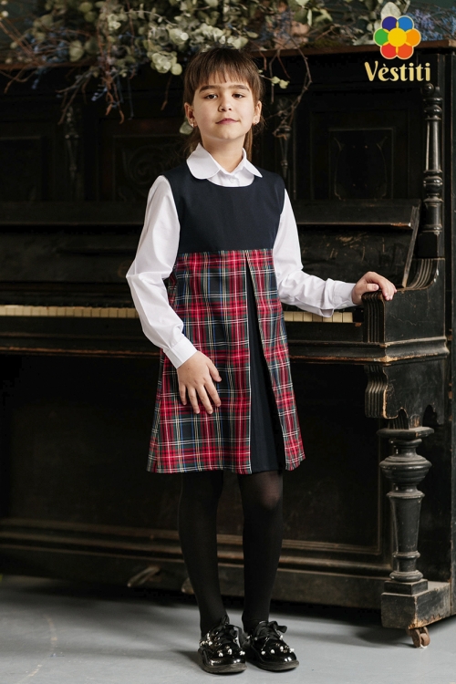 Rochie tip trapez pentru școală, pentru fete. Spatele se închide cu fermoar, pieptarul are căptușeală naturală. În față are o pliură decorativă pe mijloc. Se potrivește bine cu o cămașă.