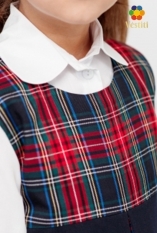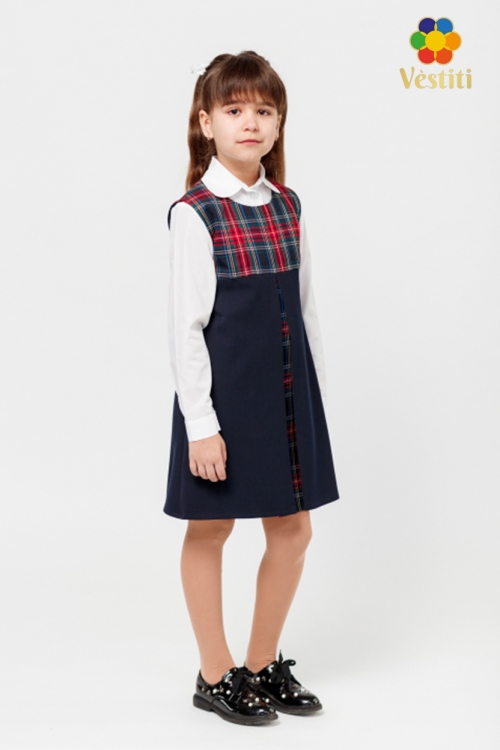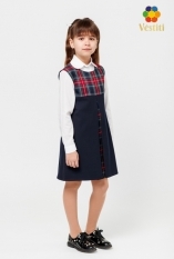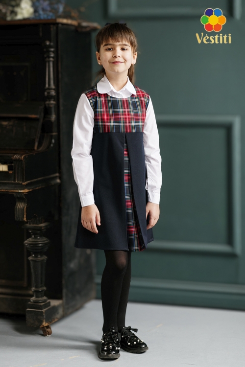 Rochie tip trapez pentru școală, pentru fete. Spatele se închide cu fermoar, pieptarul are căptușeală naturală. În față are o pliură decorativă pe mijloc. Se potrivește bine cu o cămașă.