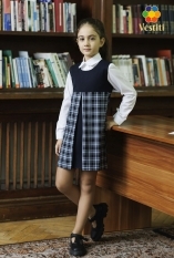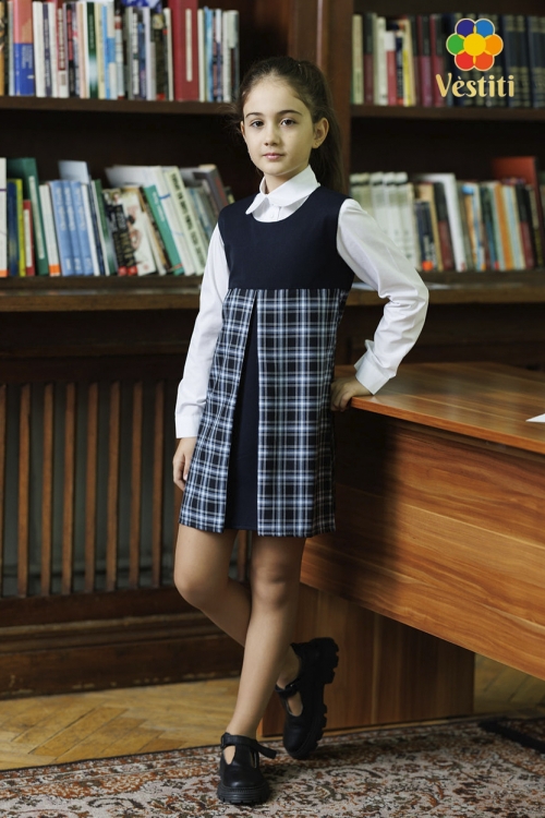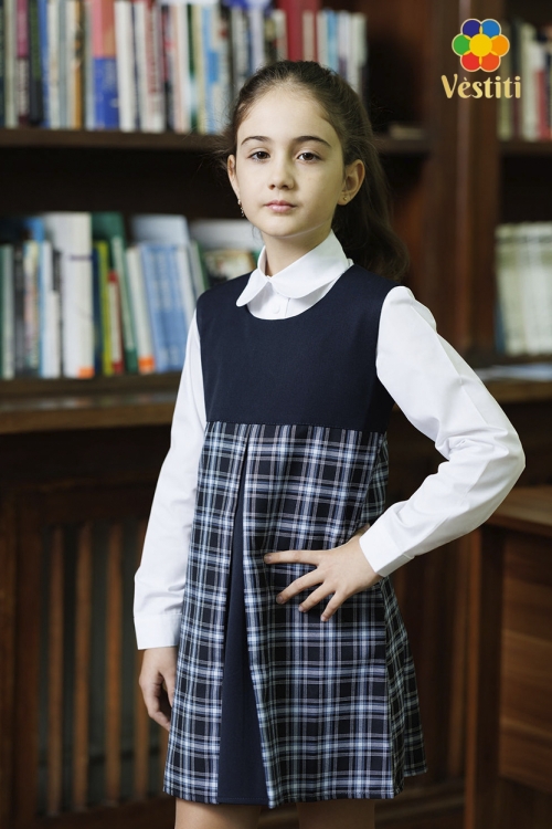 Rochie tip trapez pentru școală, pentru fete. Spatele se închide cu fermoar, pieptarul are căptușeală naturală. În față are o pliură decorativă pe mijloc. Se potrivește bine cu o cămașă.
