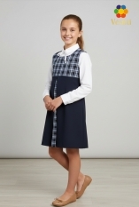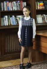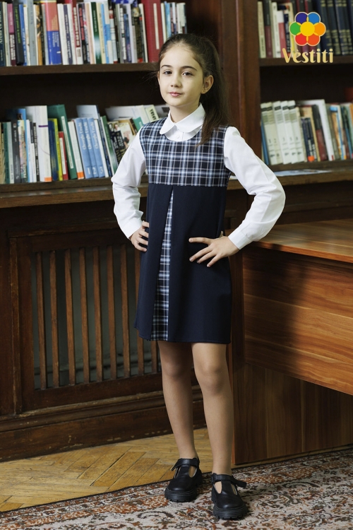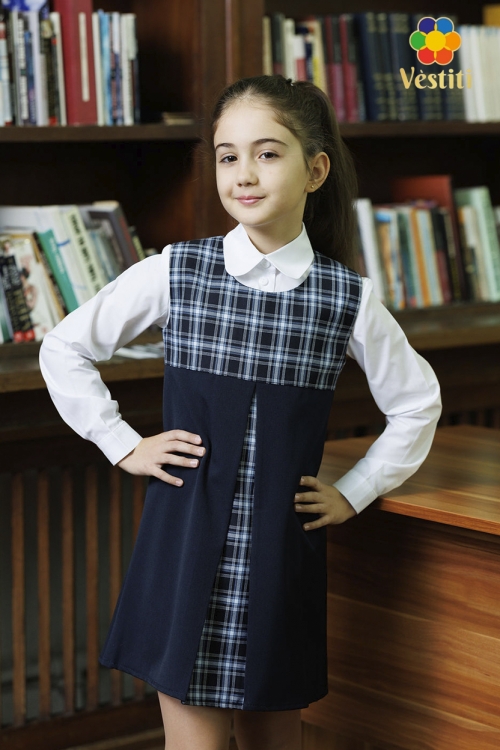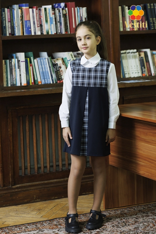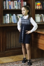 Rochie tip trapez pentru școală, pentru fete. Spatele se închide cu fermoar, pieptarul are căptușeală naturală. În față are o pliură decorativă pe mijloc. Se potrivește bine cu o cămașă.