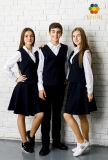 Vestă clasică albastru închis pentru fete. Confecționată din stofă de costum cu lână, oferă confort și un aspect elegant. La spate are un sistem de ajustare a taliei cu curea și cataramă, pentru o potrivire perfectă. Ideală pentru uniforme școlare, evenimente festive și ținute formale.