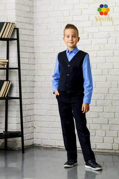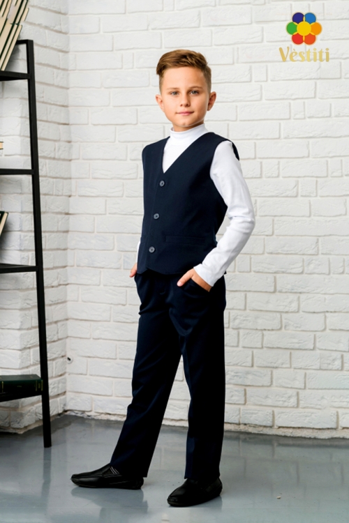 Классический темно-синий жилет для мальчиков. Модель выполнена из костюмной ткани с добавлением шерсти, обеспечивающей комфорт и презентабельный вид. Сзади предусмотрен регулируемый пояс с пряжкой для идеальной посадки по талии. Отличный выбор для школьной формы, торжественных мероприятий и официальных выходов.