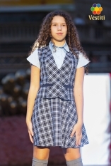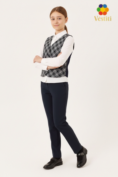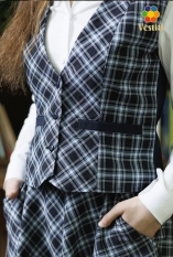 Vestă clasică în carouri pentru fete. Design elegant cu model tartan, cu buzunare decorative. Polca este realizată din material în carou sur, iar partea din spate este confecționată din țesătură uni de culoare albastru închis. Spatele este prevăzut cu un sistem de ajustare a taliei pentru o potrivire confortabilă. Modelul este completat cu o căptușeală naturală.