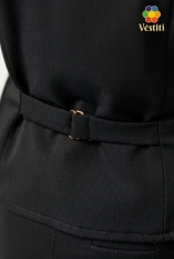 Vestă clasică neagră pentru fete. Confecționată din stofă de costum cu lână, oferă confort și un aspect elegant. La spate are un sistem de ajustare a taliei cu curea și cataramă, pentru o potrivire perfectă. Ideală pentru uniforme școlare, evenimente festive și ținute formale.