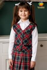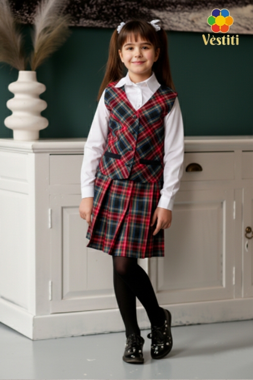 Vestă clasică în carouri pentru fete. Design elegant cu model tartan, cu buzunare decorative. Polca este realizată din material roșu mare în carouri, iar partea din spate este confecționată din țesătură uni de culoare albastru închis. Spatele este prevăzut cu un sistem de ajustare a taliei pentru o potrivire confortabilă. Modelul este completat cu o căptușeală naturală.