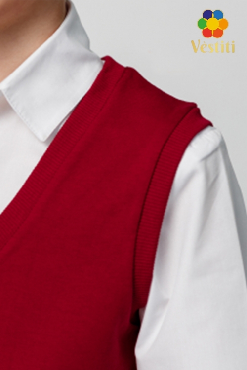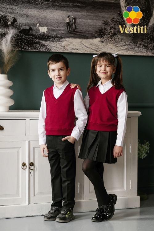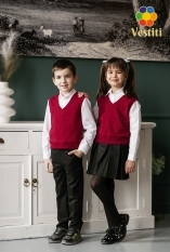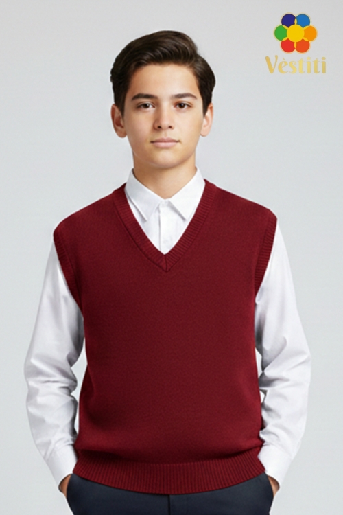 Vestă tricotată pentru băieți, realizată într-un stil clasic și elegant. Model fără mâneci, cu decolteu în V, ideal pentru purtarea peste cămașă. Țesătura este plăcută la atingere și confortabilă pentru utilizare zilnică la școală.