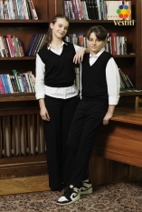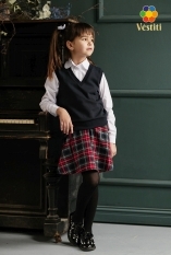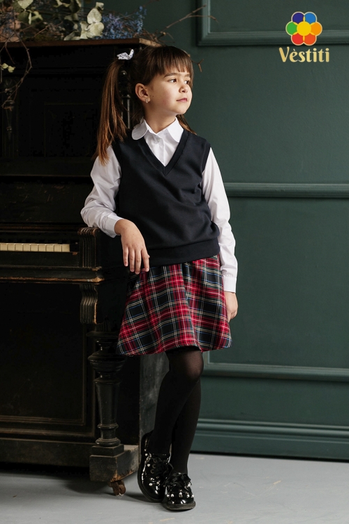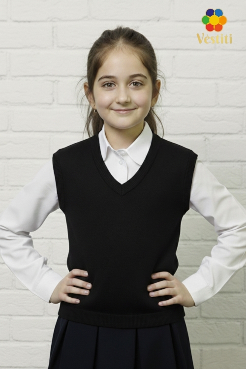 Vestă tricotată pentru fete, realizată într-un stil clasic și elegant. Model fără mâneci, cu decolteu în V, ideal pentru purtarea peste cămașă. Țesătura este plăcută la atingere și confortabilă pentru utilizare zilnică la școală.