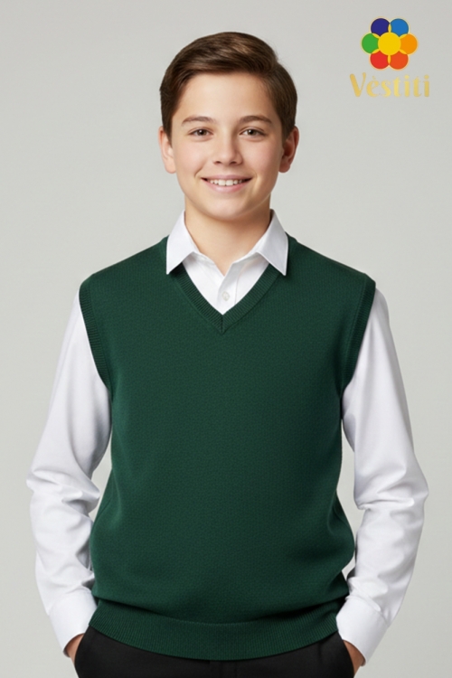 Vestă tricotată pentru băieți, realizată într-un stil clasic și elegant. Model fără mâneci, cu decolteu în V, ideal pentru purtarea peste cămașă. Țesătura este plăcută la atingere și confortabilă pentru utilizare zilnică la școală.